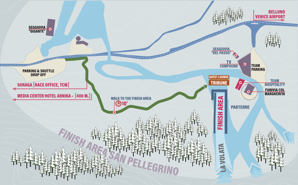 The parterre and grandstands are located at the base of the Col Margherita cable car, the main access point to the slope and the vibrant heart of the weekend’s competitions.